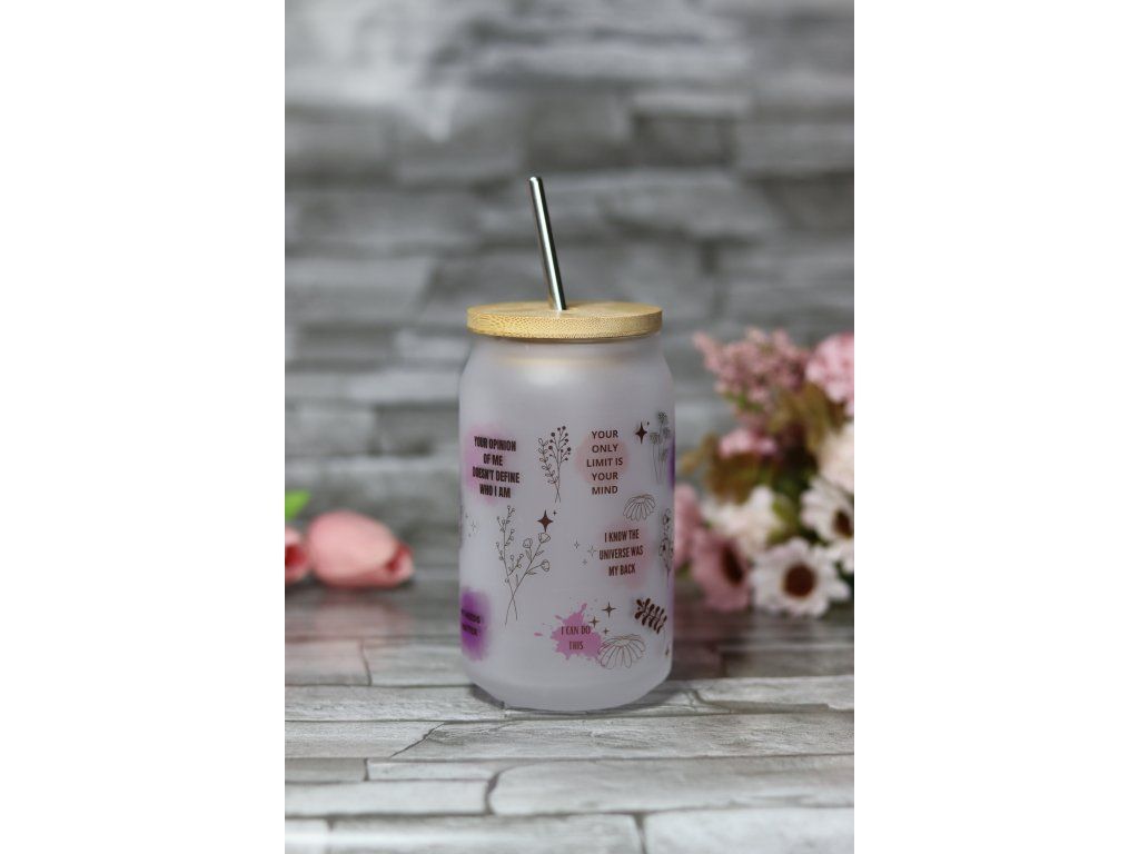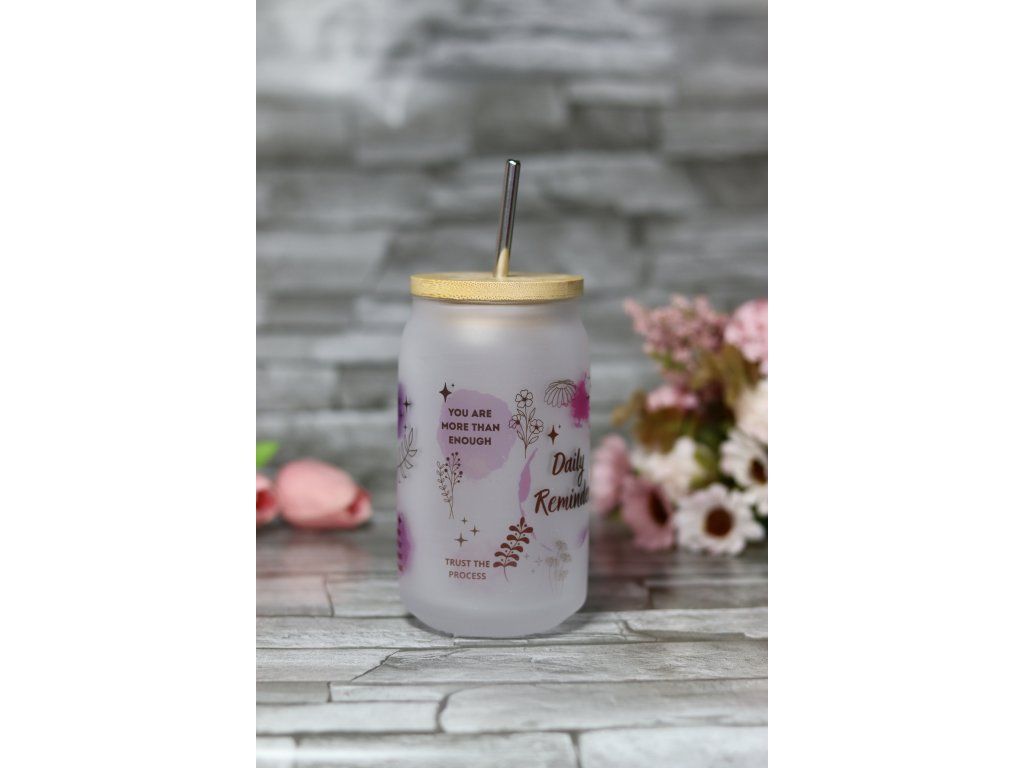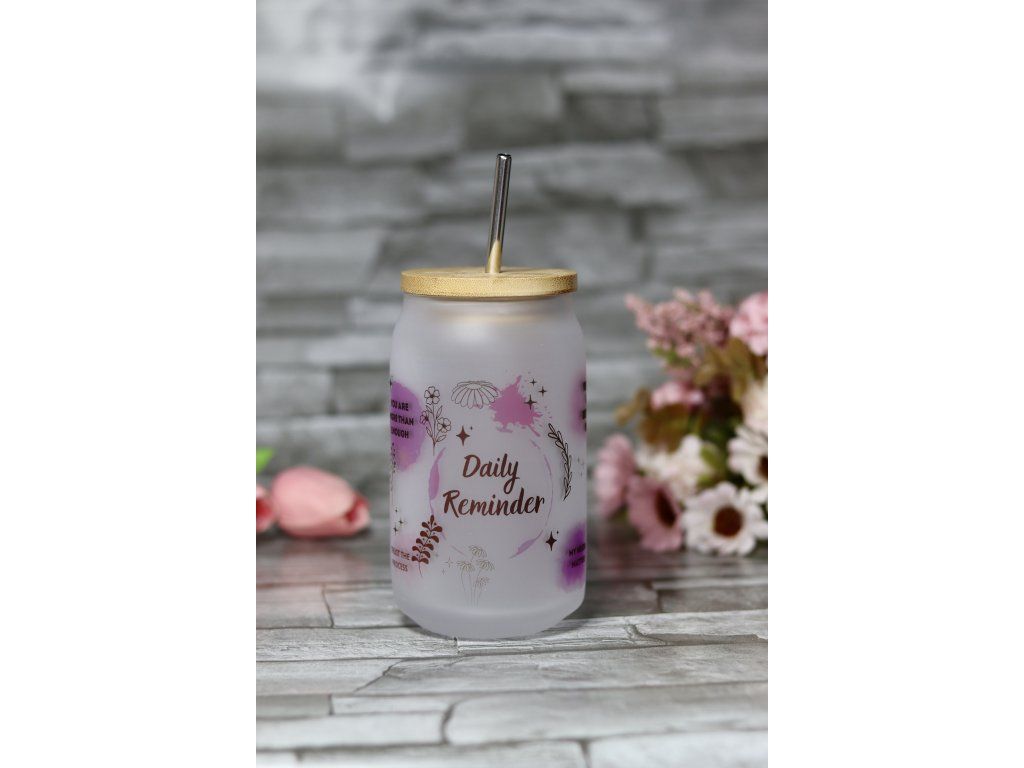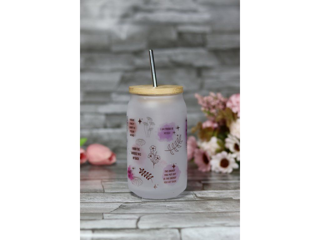 Matná sklenice o objemu 400ml. S bambusovým víčkem a nerezovým brčkem.Sklenička NESMÍ DO MYČKY! Omývat jemně v ruce pod vlažnou vodou. Není vhodná pro příliš horké nápoje.